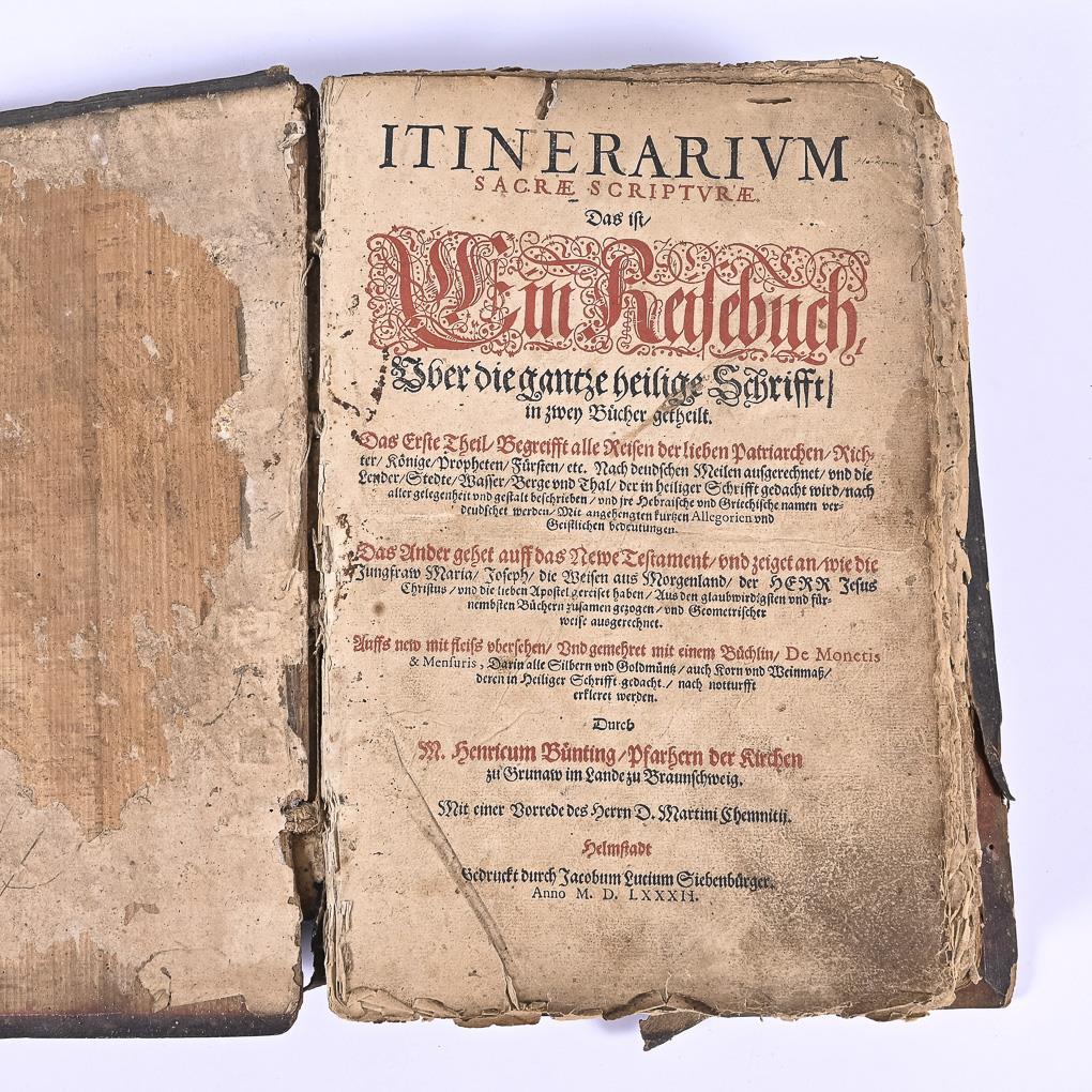 Title page, (12), 6 maps on double pages (including a 'world map' with the suggestion of America, 316, (10) pages. Second part: title page, (4) with a map, 136, (14) pages. / Title page: "De Monetis et mensuris sacrae scripturae - This is an actual calculation and description of all coinage and mass in sacred scripture ...", (5), 32 pages (another about 7 pages missing). Strong signs of age, joint broken, clasps missing, endpapers missing, leather binding with missing part. Maps torn, some loose. Handwritten notes at the beginning..