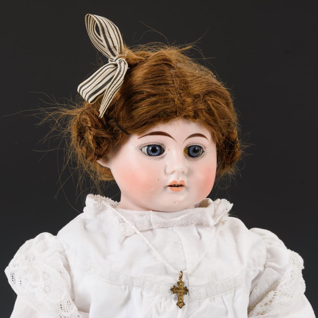 Feste blaue Augen, offener Mund, festgeklebte braune Mohairperücke. Lederkörper mit Gliederarmen. Weißes Kleid mit lachsfarbener Schärpe. Einige Finger geklebt, Arme übermalt, 1 Auge geklebt, 1 minimaler Chip am Brustansatz.