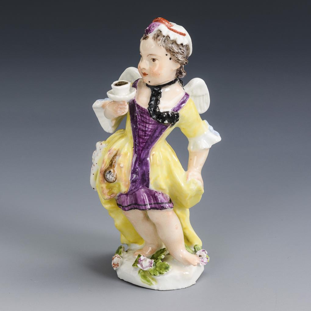Small dressed cupid with clock, painter's cloth and cup. Right foot, both arms and wings restored.
