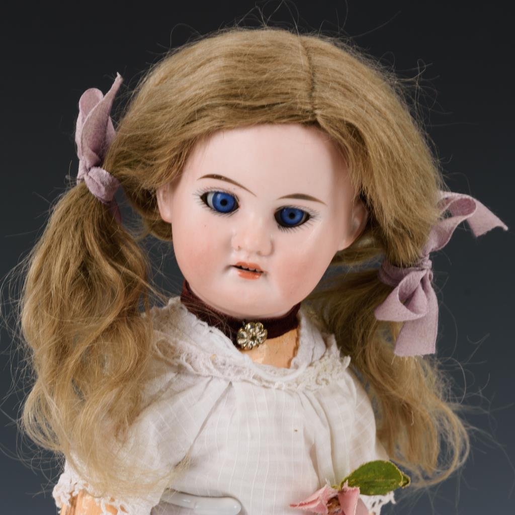 Kurbelkopf, blaue Schlafaugen, offener Mund, festgeklebte blonde Mohairperücke. 9-teiliger Gliederkörper. Weißes Kleid, rosa Schleifen. Haarriss am Hinterkopf, Körper mit Farbdefekten, einige Finger bestoßen.