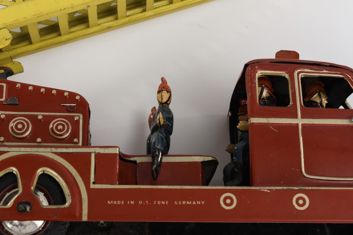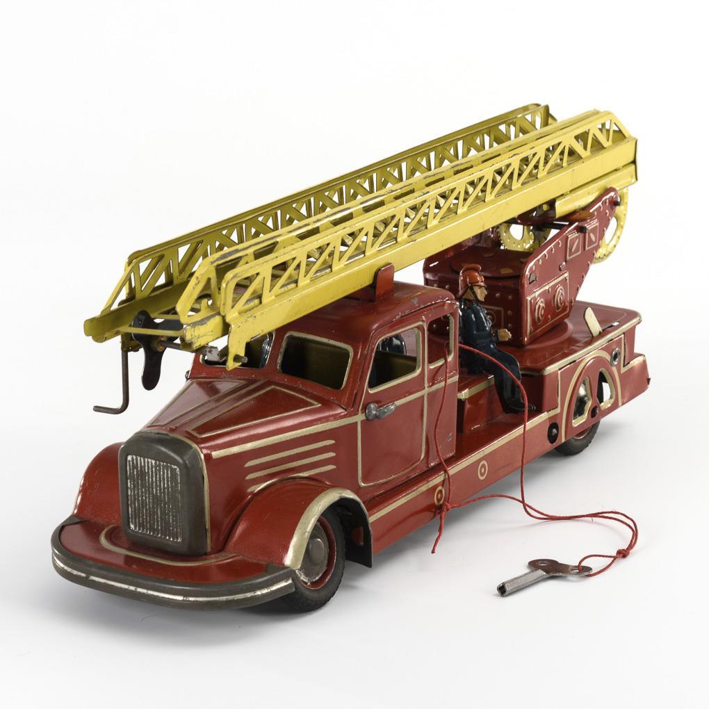 Red fire truck with yellow turntable ladder. Movement and turning mechanism intact. 1 key. Slight signs of age, movement intact.