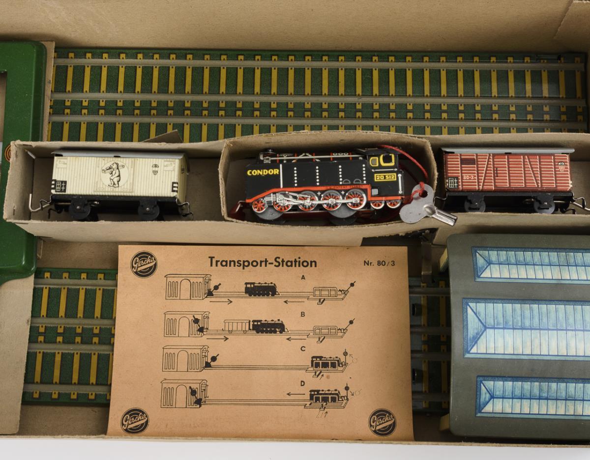 Small railroad set (No. 80/3) with locomotive, 2 cars, rails and shed. Movement runs, 1 key. Unplayed, box with small defects.