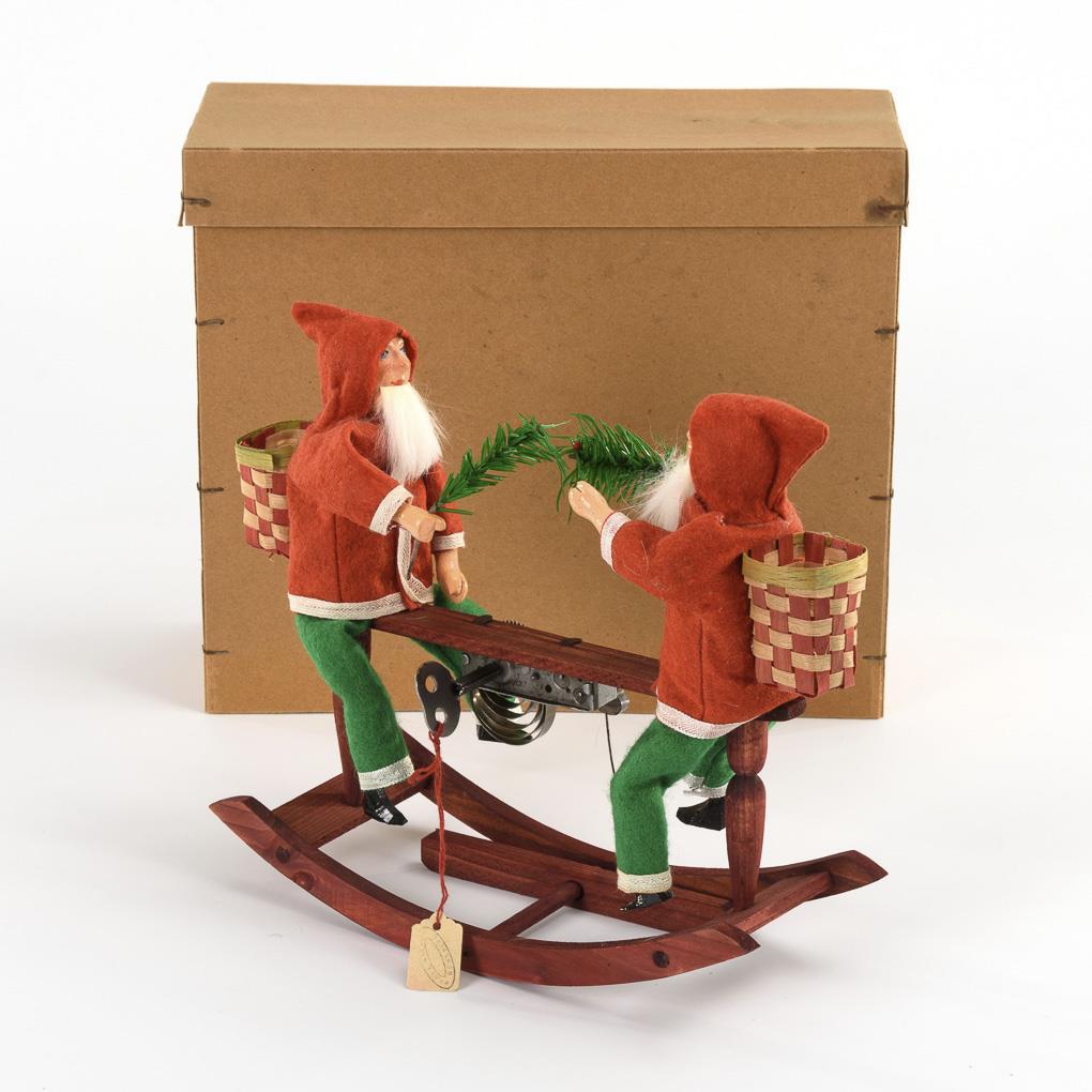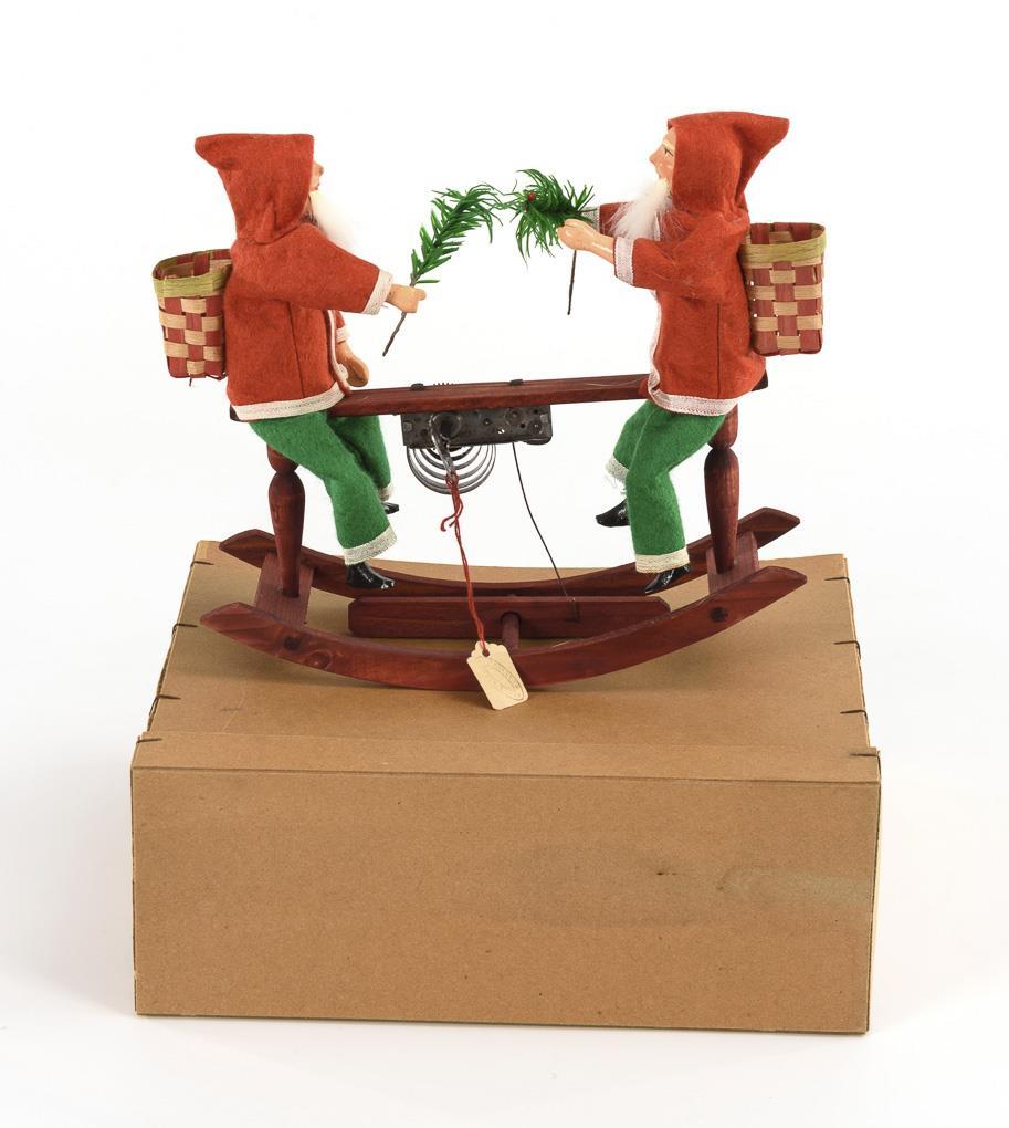 2 Santa Clauses on rocking rocker, in original box. Unplayed, spring movement intact.