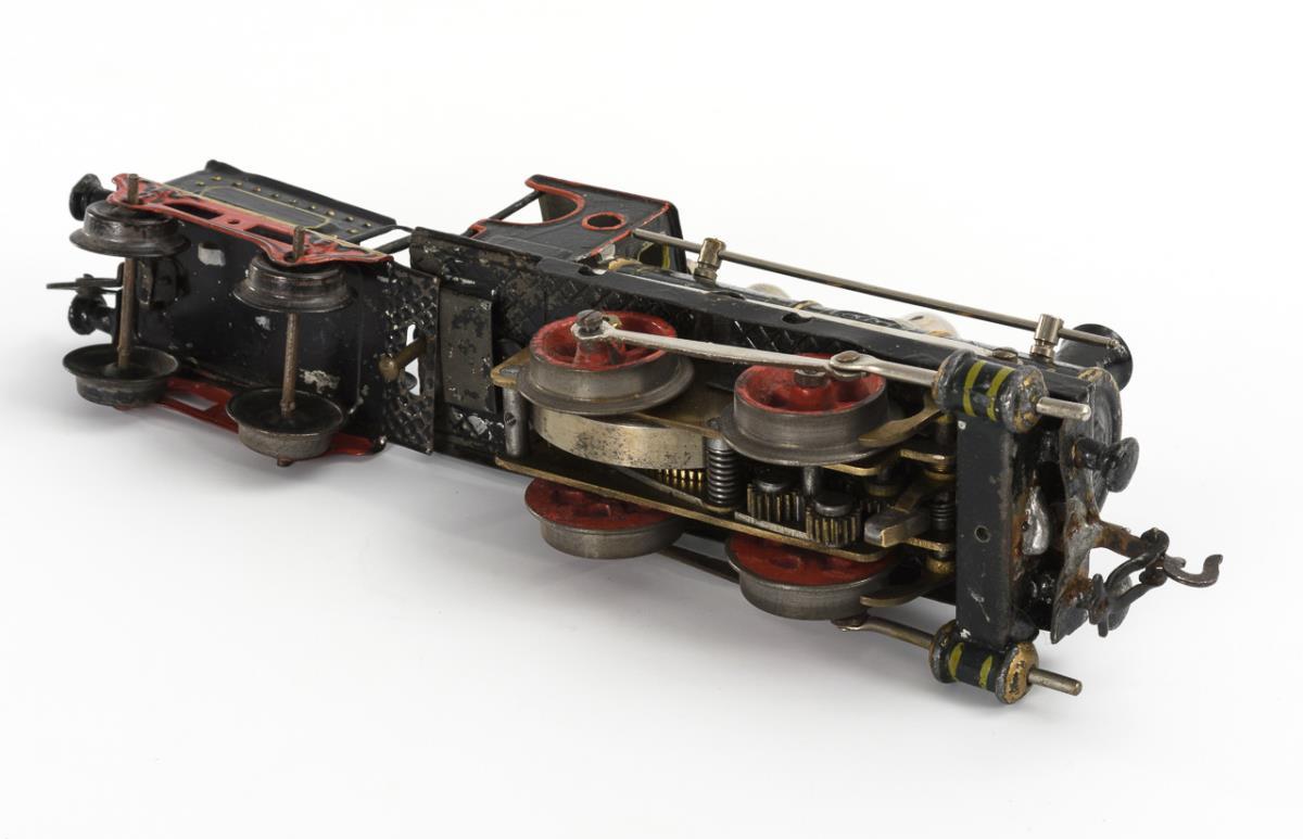 Hand-painted locomotive with spring drive. L 17 cm. Plus tender (L 9 cm) and 3 rare Mitropa cars (2x dining car and 1x sleeping car with hinged roof, L 20 cm each). Played, with signs of age, solder joints, movement not intact (in need of overhaul), key missing.