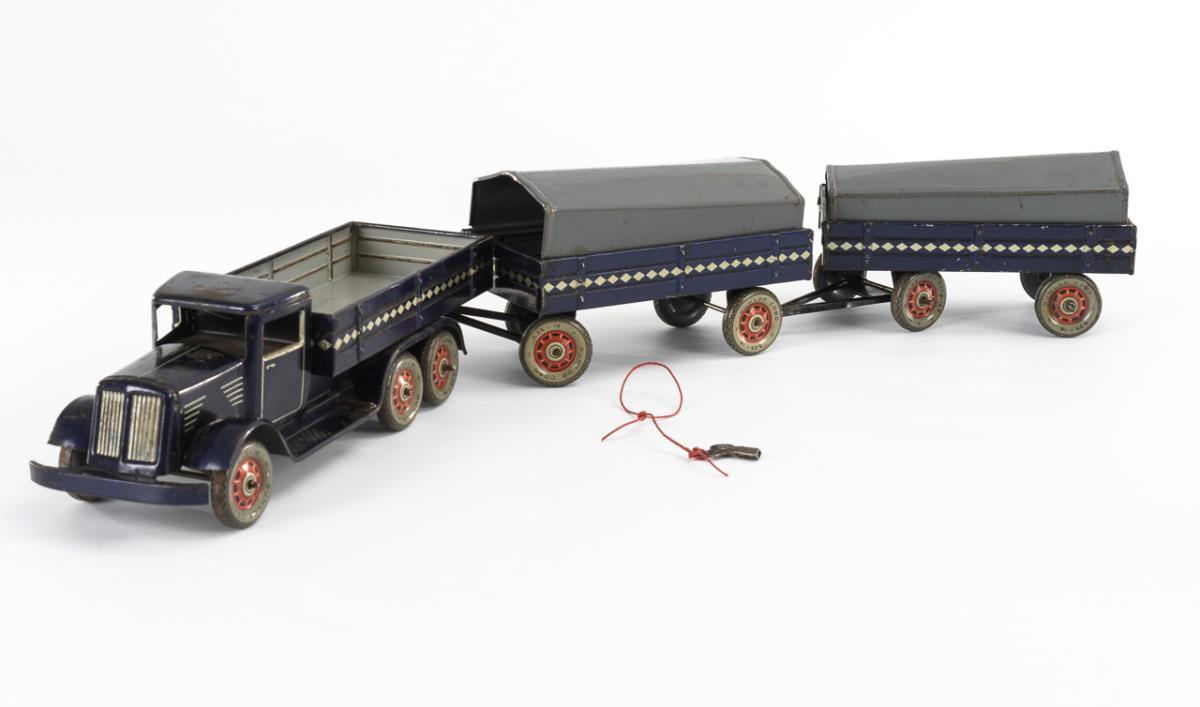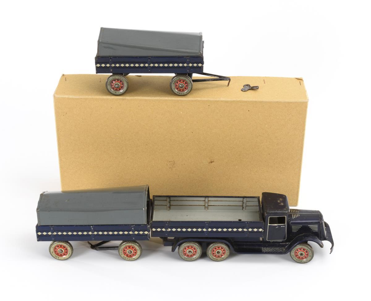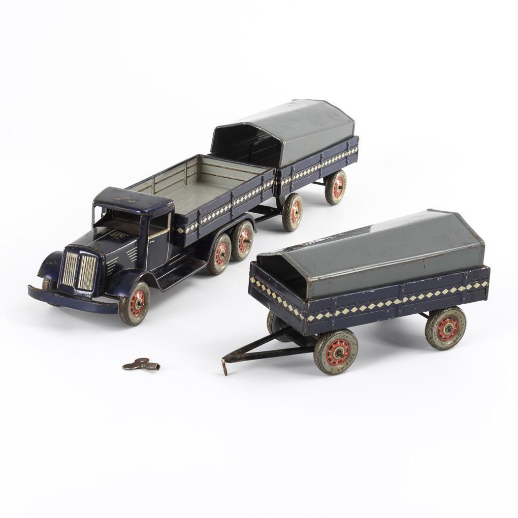 Dark blue truck with diamond pattern, intact movement and key. Comes with 2 matching trailers with removable gray top. In original? Box without inscription. Traces of age and small paint defects.
