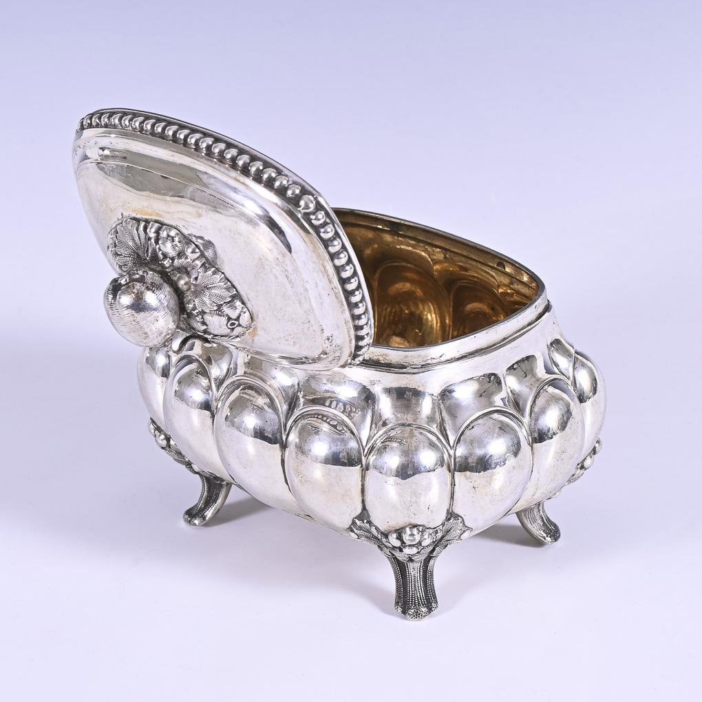 Richly decorated silver box with boss decoration. Gilded. Small dents, slight traces of corrosion inside.