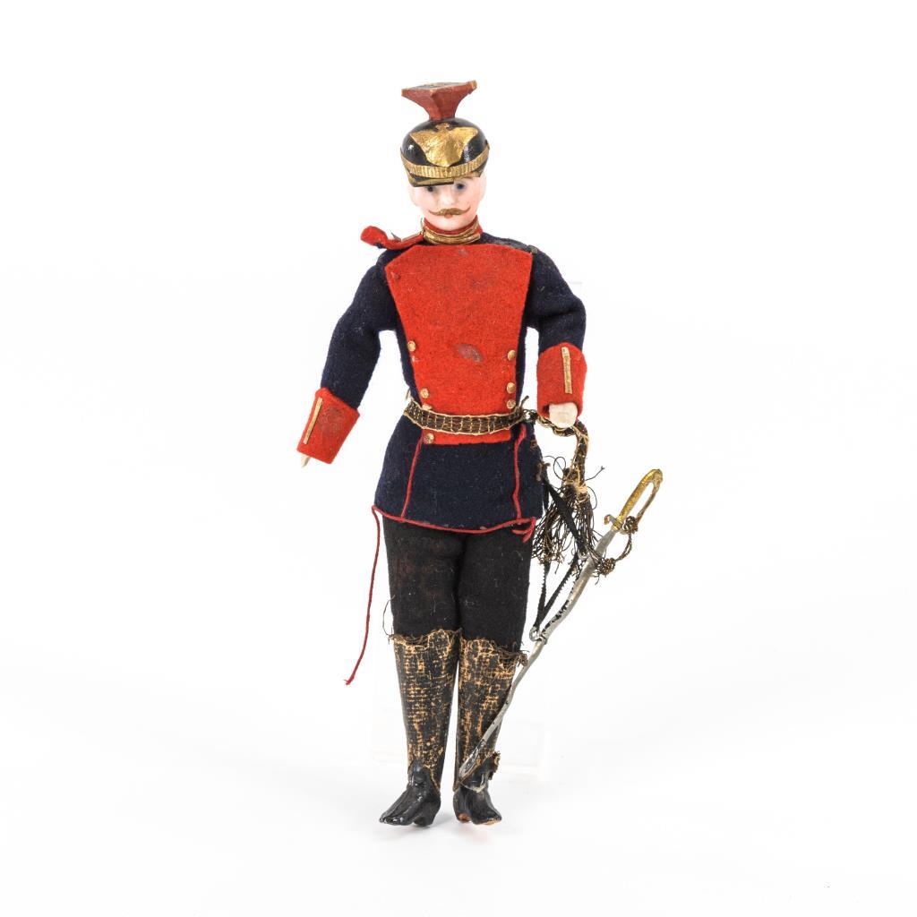 Offizier mit Brustkopf und modelliertem Schnurrbart, in dunkelblau-roter Uniform aus Filz, mit Tschapka für Unteroffiziere oder Einjährig-Freiwillige des Ulanen-Regiments. Mit Degen und schwarzen Stiefeln. Altersspuren.