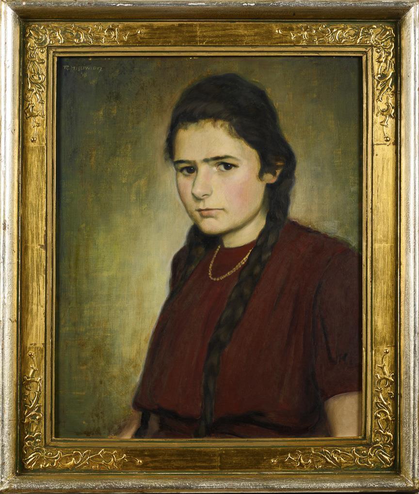 Portrait of a young woman in a red dress with long braids.