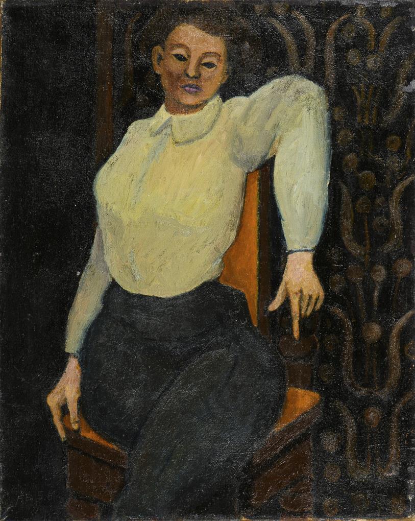 Picture of a woman sitting twisted on a chair with demonic black eyes. Paint chips at the edges.