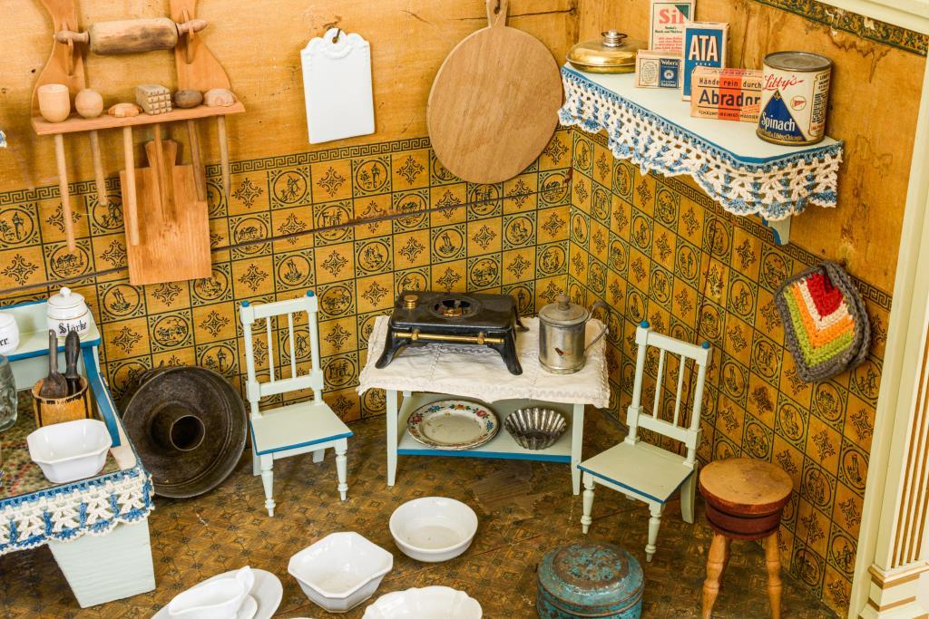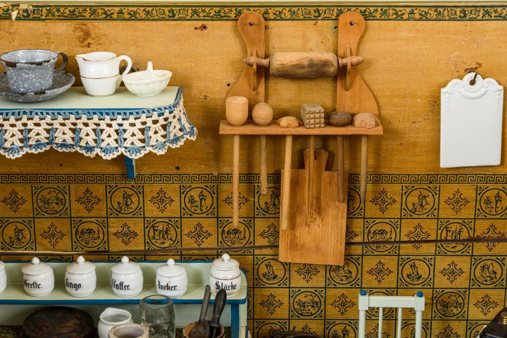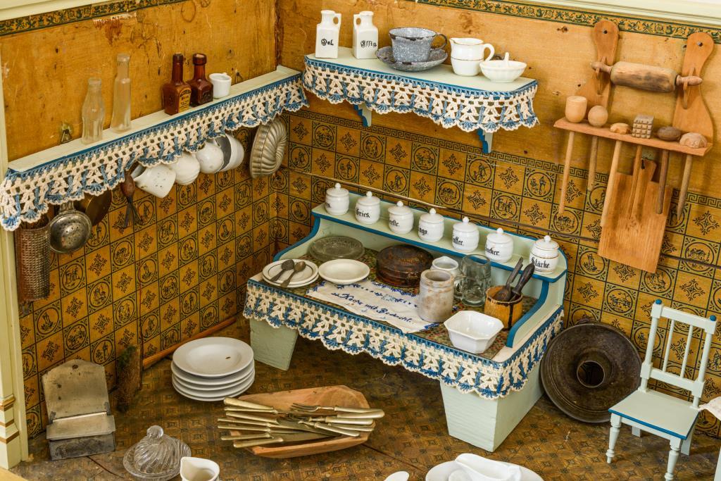 Rechteckiges Gehäuse mit profilierten Frontsäulen, holländische Tapeten, Außenwände original gefasst. Helle Möbel und reiches Zubehör aus Porzellan, Weißblech und Holz, u. a. 2 Brotdosen und Hackklotz. Frontsäulen übermalt, Seitenfassung original, alte Tapeten teils schadhaft (Bodenpapier mit Fehlstellen).