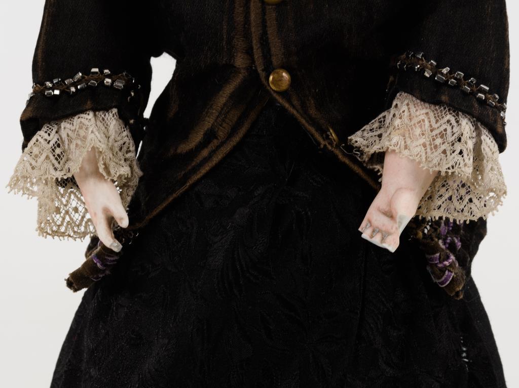 Brustkopf, feste blaue Augen (wohl nachgeklebt), offen-geschlossener Mund mit gemalten Zähnen, modellierte blonde Haare, Ohrringe. Lederkörper in schwarzer Kleidung mit Schürze. Kopf am Hals geklebt, Körper mit Reparaturen, Hände defekt.