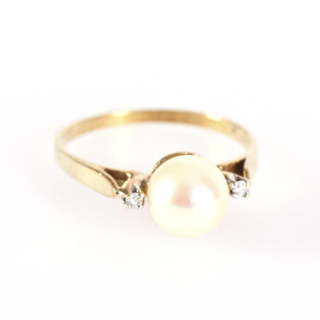 Cultured pearl and 2 chaton set micro diamonds between narrow rail.