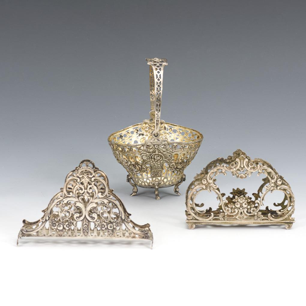 2 napkin holders and 1 silver plated handle basket. Signs of use, some small dents.