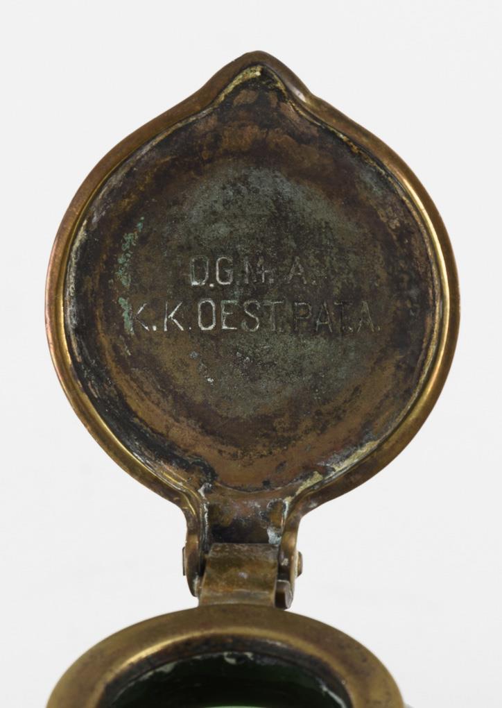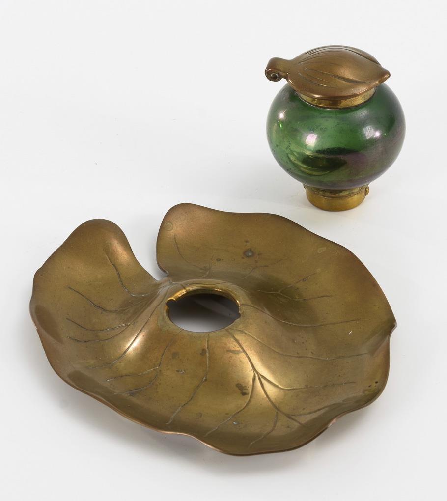 Spherical glass inkwell with brass mounted stand and hinged lid in the shape of a leaf (this hallmarked inside "D.G.M.A. K.K. OEST. PAT. A."), inserted into a brass bowl in the shape of a lily pad.