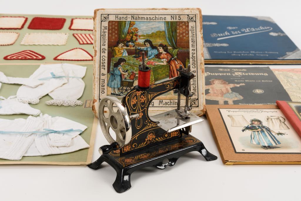 Jugendstil-Nähmaschine Casige (Carl Sieper, gemarkt: DRGM No. 205579) im Originalkarton / Schnittmusterbuch: "Puppenmütterchens Nähschule" / Schnittmuster: "Das Buch der Puppen-Kleidung", bearbeitet von Tante Marie und Helene. Leipzig o. J. / "Buch der Wäsche", Verlag der deutschen Moden-Zeitung, Leipzig o. J. / 2x Näh- und Häkelproben aus einer Hauswirtschaftsschule von 1879. Altersspuren, teils kleine Defekte.