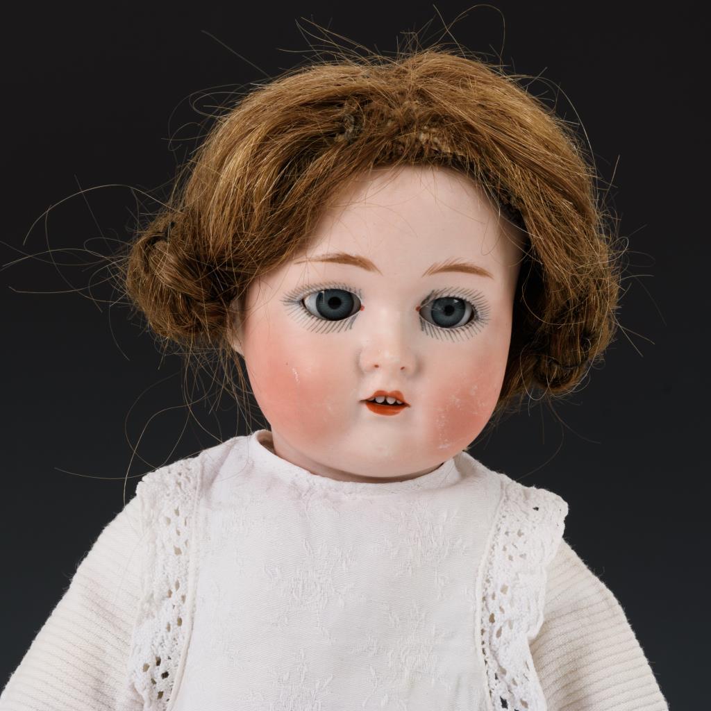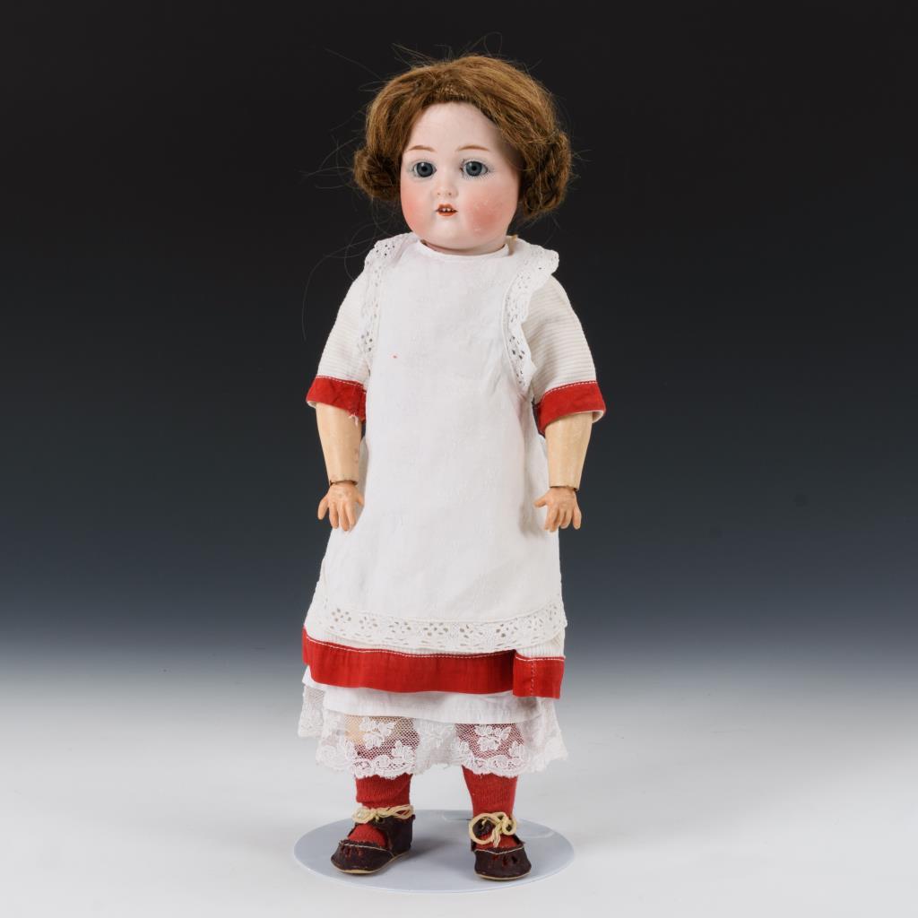 Kurbelkopf, blaue Schlafaugen, modellierte Augenbrauen, offener Mund, Zähnchen, dunkelblonde Echthaarperücke. 13-teiliger Gliederkörper. Weißes Kleid mit roten Borten, weiße Schürze, rote Strümpfe. Kopf durchleuchtet: ohne Defekte. Augen und Hände ergänzt, Körper partiell übermalt, 1 Fuß repariert.