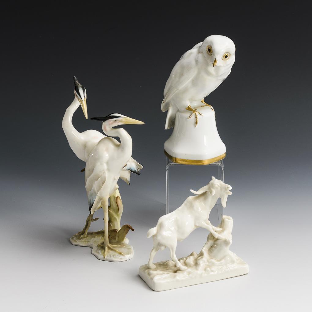 Art Deco owl Hutschenreuther. Design Prof. Fritz Klee (1876-1976). White, with gold staffage. Gold minimally rubbed. H 15,5 cm. / Group of herons Hutschenreuther, design Hans Achtziger (1918-2003). Polychrome onglaze painting. Several small chips. H 21 cm. / Goat Nymphenburg. Model no. 434. white. 11,5 x 12 x 5 cm. Owl: gold minimally rubbed.