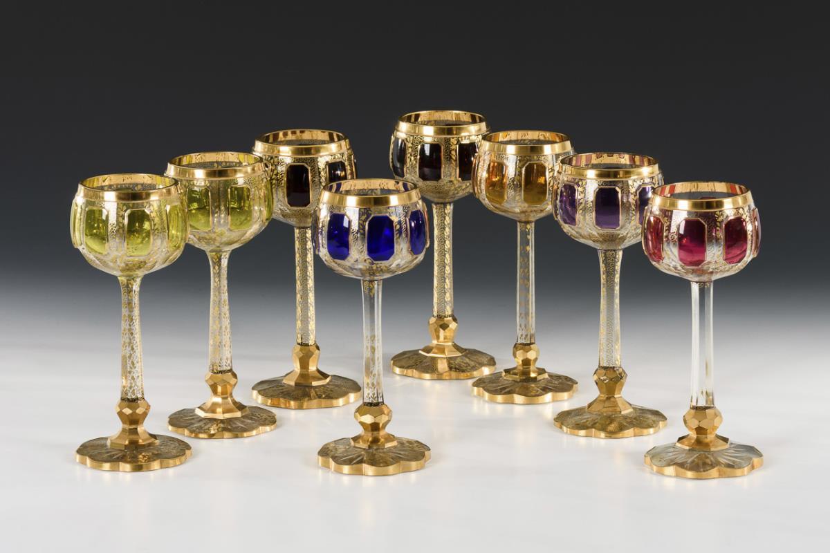 Colorless glass with various colored overlay, gold staffage. H 20 cm.