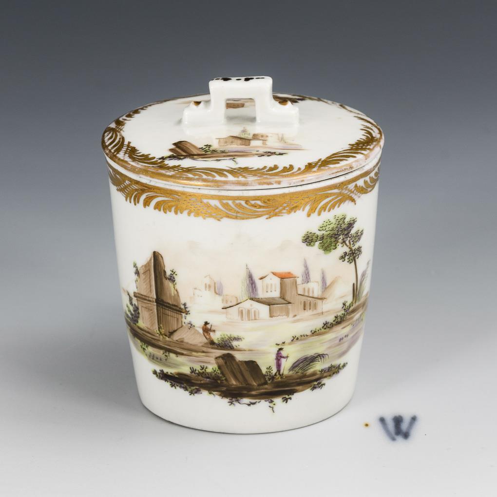 Tapered cup with angled handle and lid with angled handle. On the front the depiction of a landscape with architecture and staffage. Minimal gold abrasion, small bump on the rim of the cup.