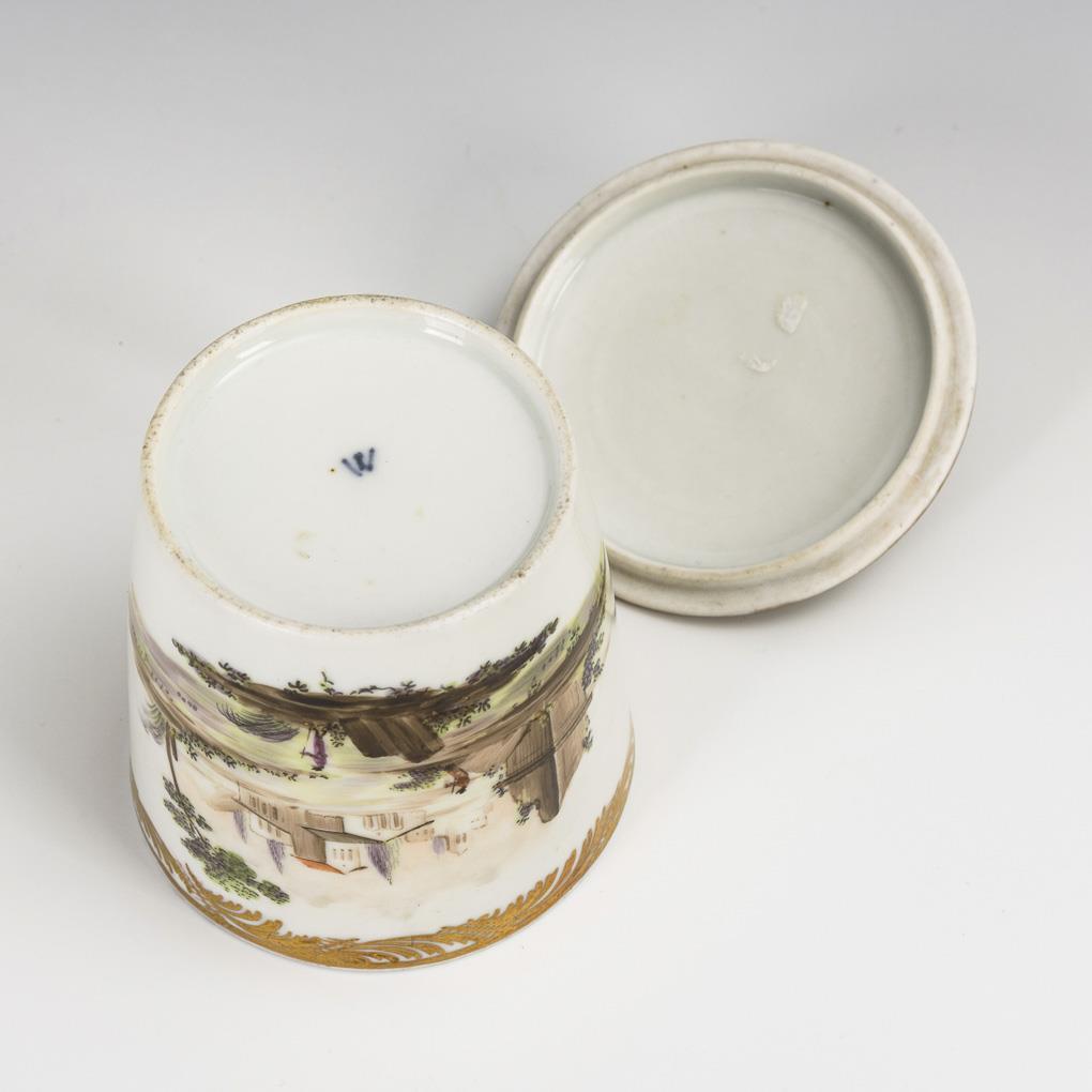 Tapered cup with angled handle and lid with angled handle. On the front the depiction of a landscape with architecture and staffage. Minimal gold abrasion, small bump on the rim of the cup.