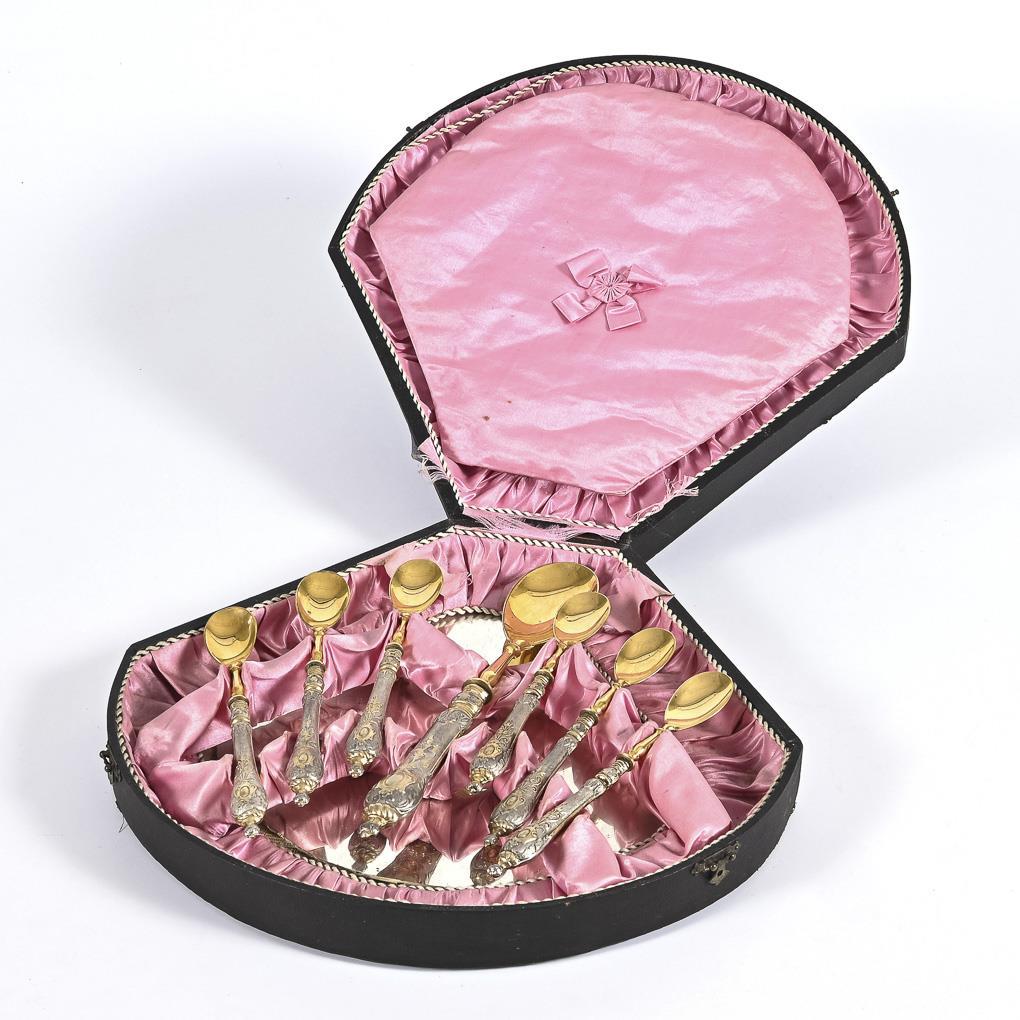 Elegant set with silver handles in relief and gilded scoops: 1 serving spoon and 6 ice cream spoons. In original state casket with rosé fabric interior and 2 interior mirrors. 3 spoons with small dents on the handle, casket with signs of age.