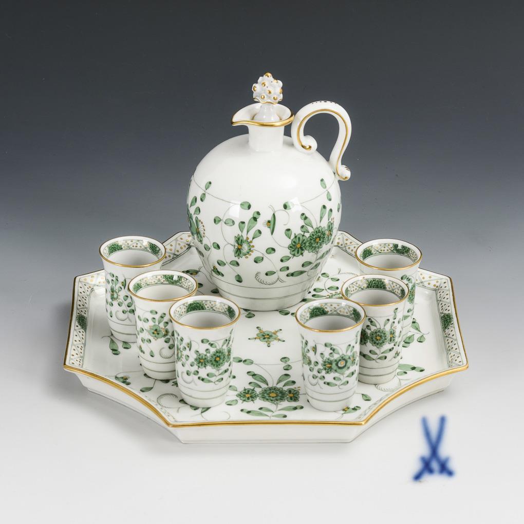 Smooth shape. Liqueur decanter with stopper (h 14 cm), 6 liqueur cups (h 5 cm) and 1 tray (21,5 x 21,5 cm).