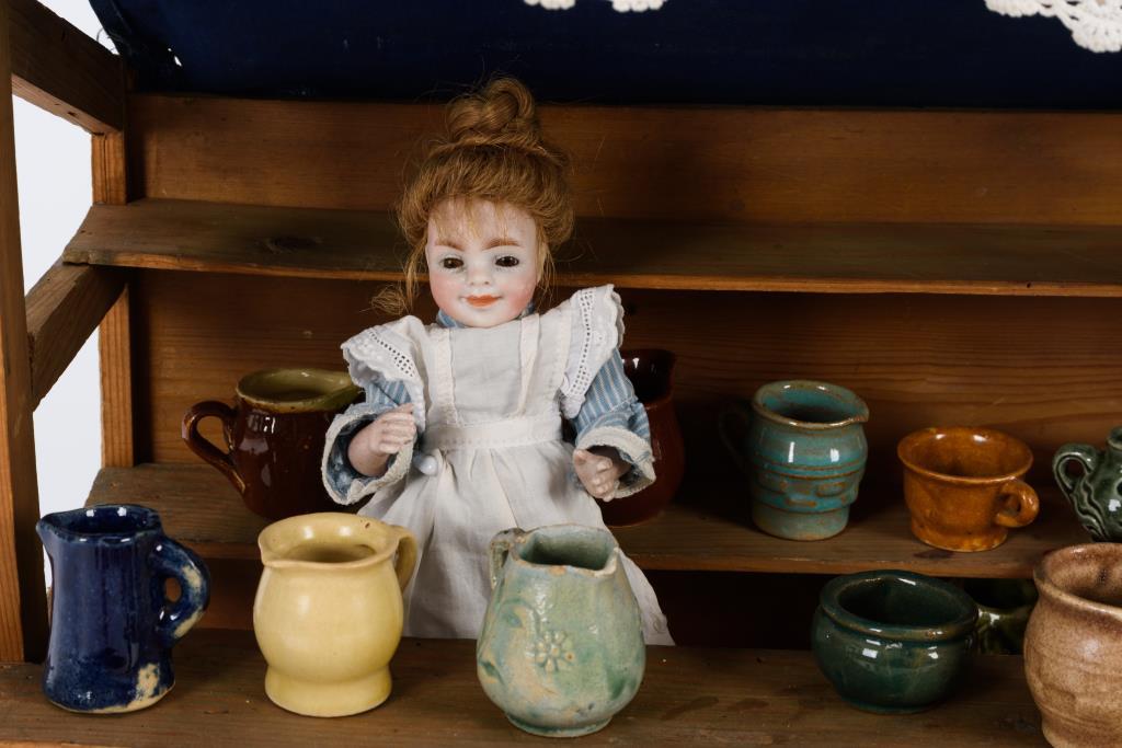 Kleiner Marktstand mit Keramikwaren und Körben. Dazu Ganzbiskuitpüppchen (Weingart, Ohrdruf) als Verkäuferin. Keramik teils mit kleinen Bestoßungen.