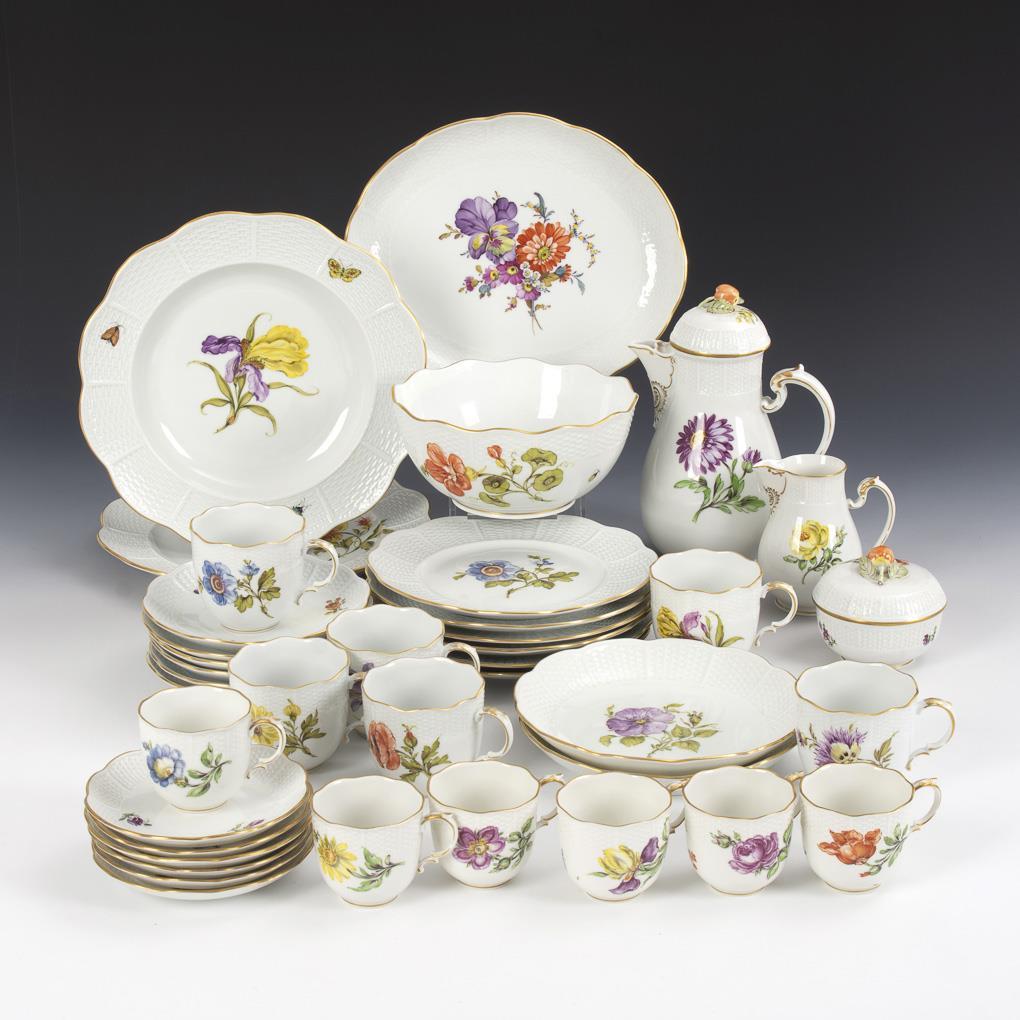 39 pieces. Form "Altozier". Coffee pot (h 20.5 cm), creamer, sugar bowl, 6 coffee cups with 6 saucers, 6 demitasse cups with 6 saucers, 6 breakfast plates, 1 soup plate, 1 dinner plate, 2 saucers for soup cups, 1 oval bowl (L 24 cm) and 1 sink (Ø 14.5 cm).