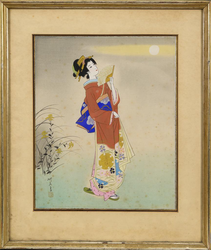 Young woman in spring kimono contemplating the moon. Slightly foxed.