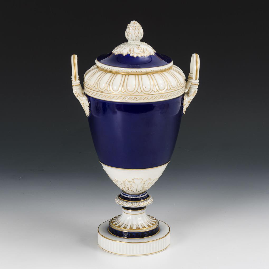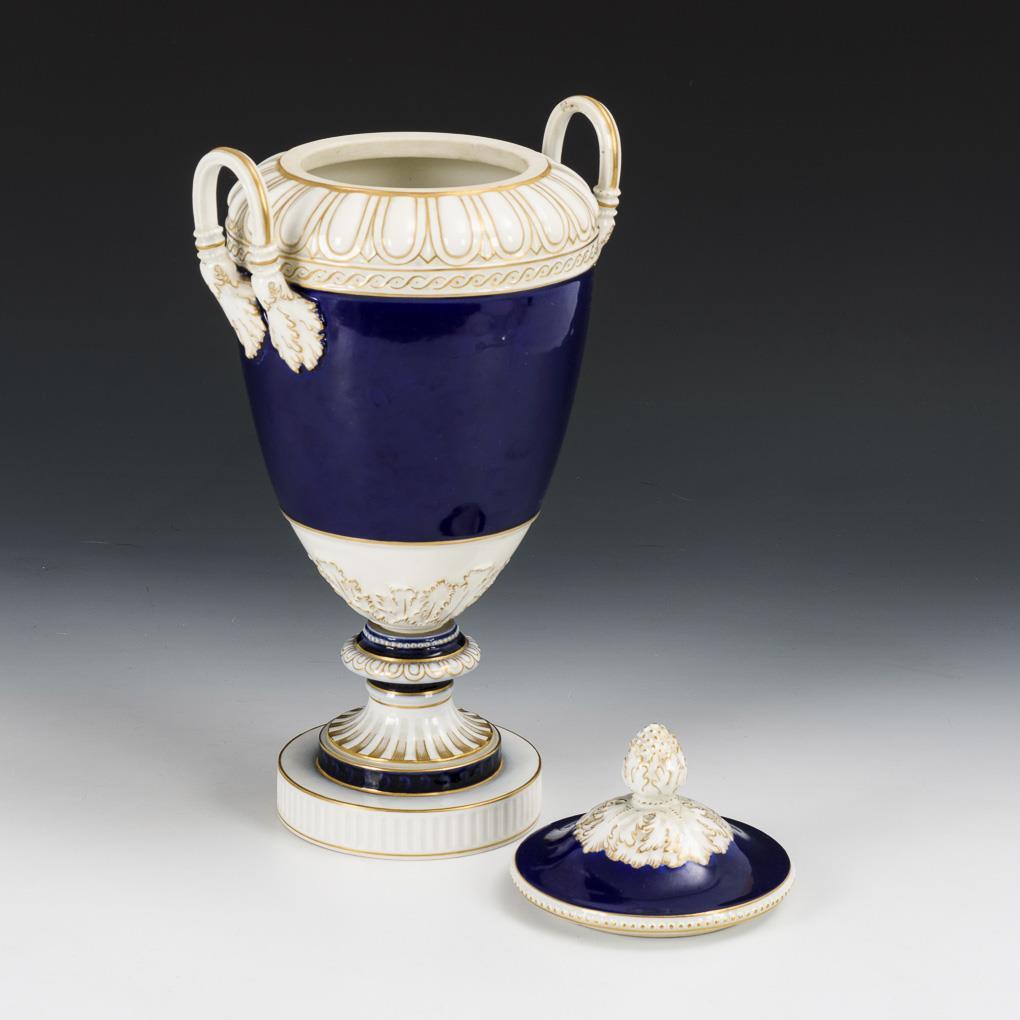 Weimar vase. Ovoid body with tongue band relief, two acanthus leaf handles, knobbed lid, fluted round foot, on round plinth. Lid restored.