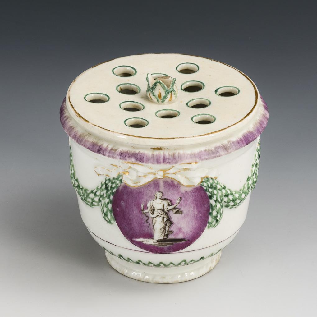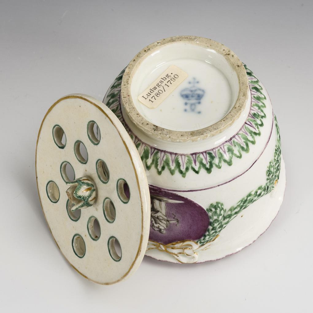Cylindrical body with indented stand relief laurel garlands and openwork pommel lid. On both sides a purple medallion with a grisaille painted antique figure. Flower knob bumped, gold rubbed.