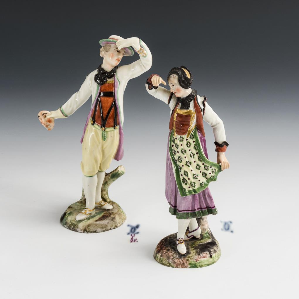 1x dancing woman in traditional costume: design by Johann Christoph Haselmeyer (died probably 1771), 1766. / 1x dancing peasant with mask in his right hand: design probably by Joseph Nees (1730 Memmingen - 1778 ibid.), 1765/67. Dancer: right hand and fingers of the left hand restored, mask missing; dancer: hat rim restored.
