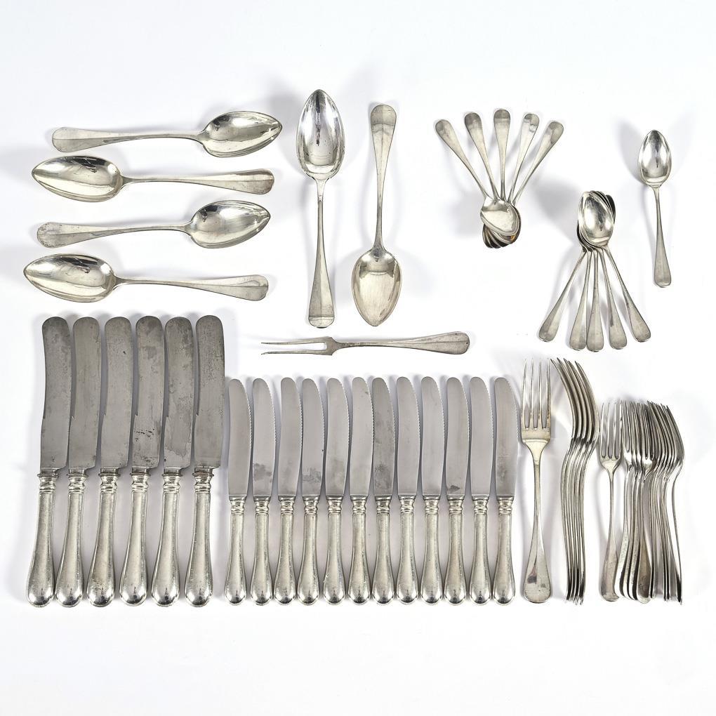 Smooth form, with intertwined monogram engraving: 6 menu forks, 6 menu knives, 6 soup spoons, 12 small forks, 12 small knives, 11 coffee spoons and 1 meat fork. Minimal signs of age and use.