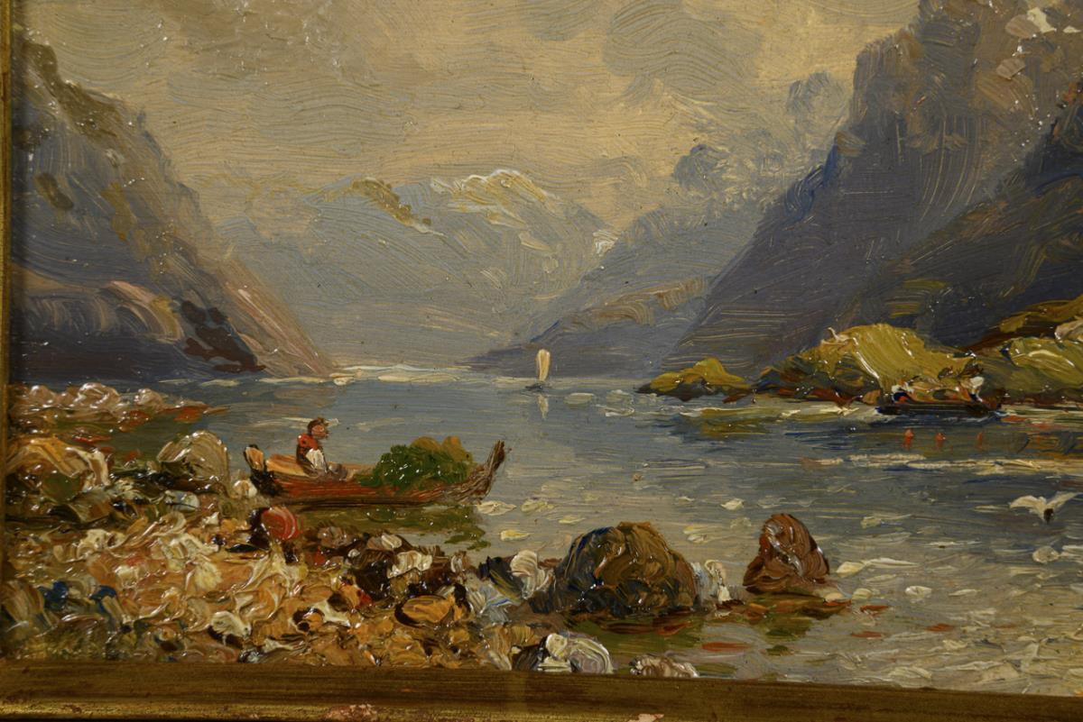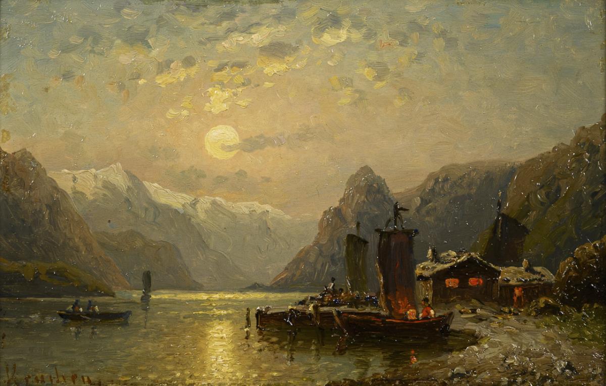 Each depicting a fjord with boats and steamers as well as a village near the shore by day or at full moon.