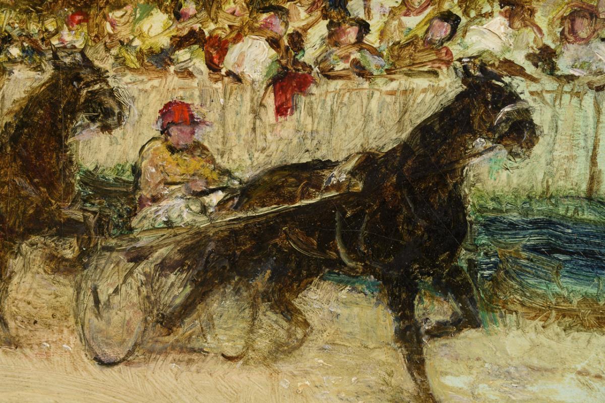 The animals with the jockeys in the sulky at a fast gallop on the racecourse in front of the grandstand. Paint chips in the corners.
