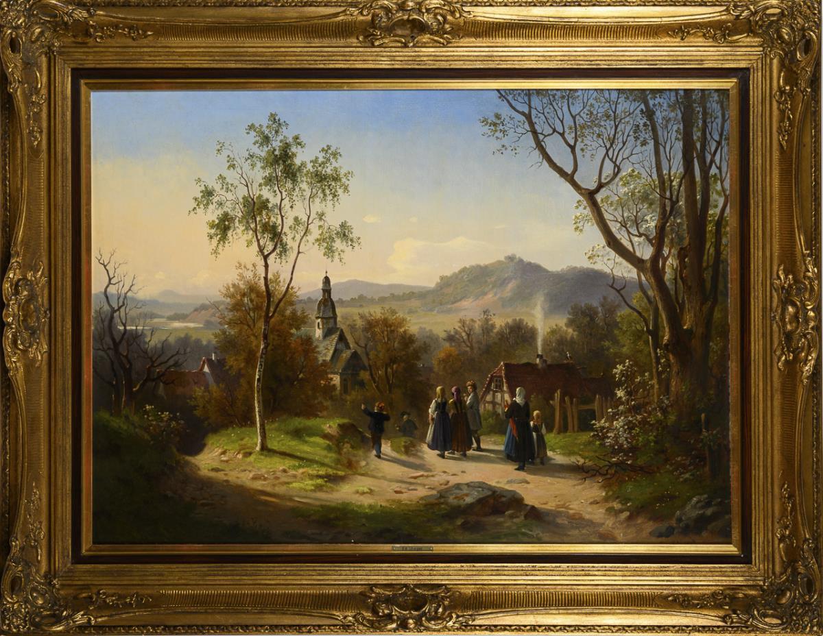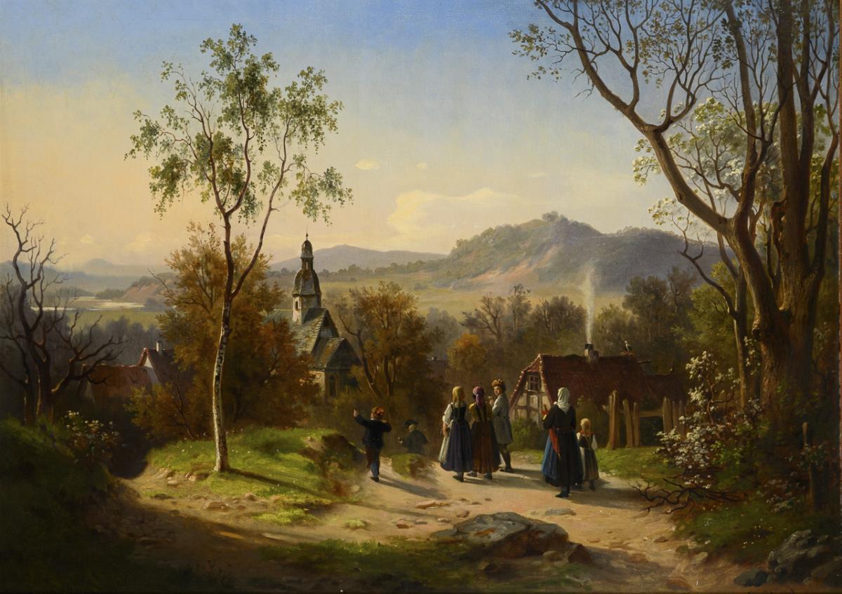 The people on a forest path towards the church down in the village in the idyllic sunlight. canvas doubled.