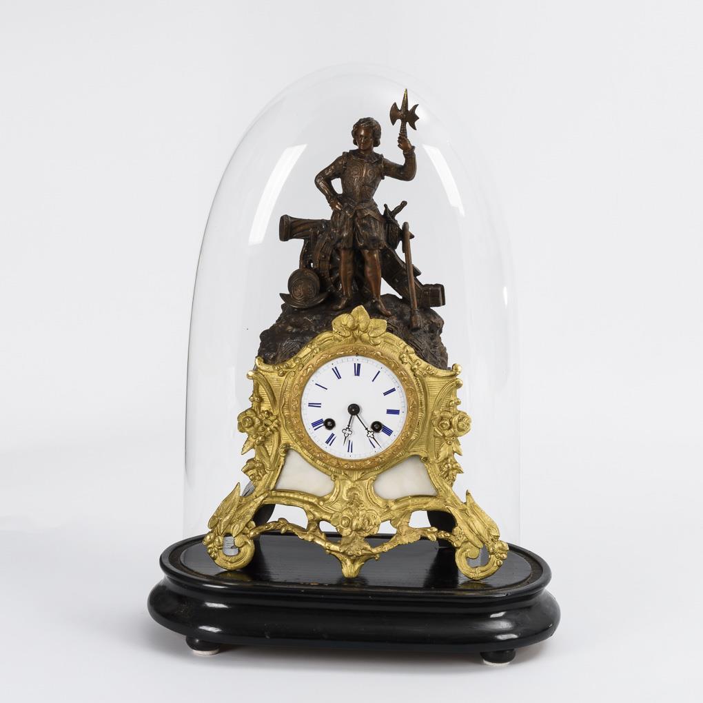 Bronze gilt, cast metal dark bronze finish. Clock 38,5 x 23,5 x 10,5 cm, glass dome H 50,5 cm.
