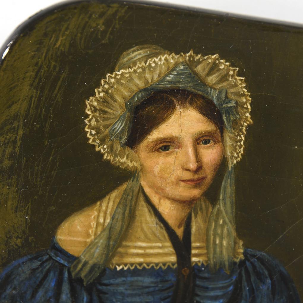 On the hinged lid finely painted couple in period clothing. Painting crackled, old retouched on the edge, overpainted.