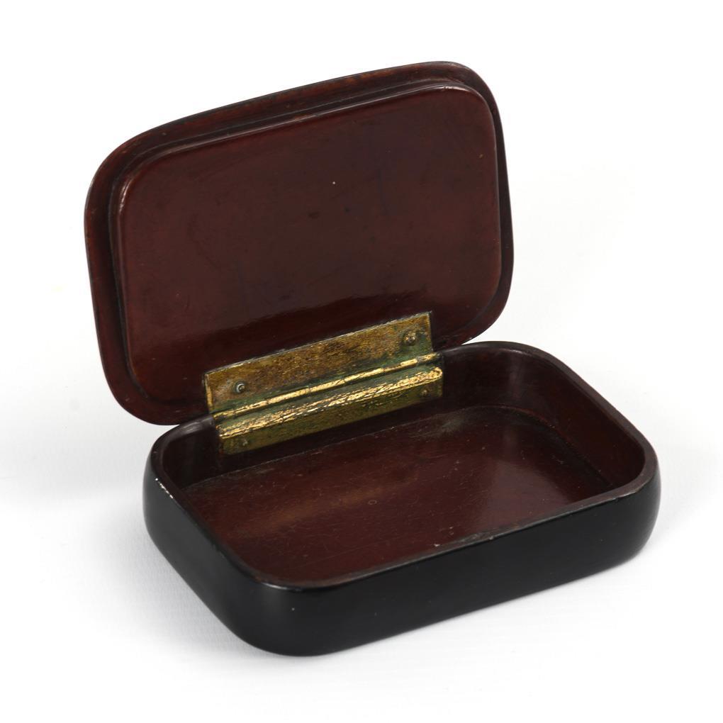 Paper mache, black exterior, painted in red, lacquer painting. 2.5 x 10.5 x 7 cm.
