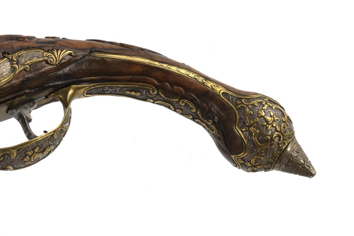 Smooth bore barrel, partially decorated with rocaille relief and crowned Bourbon fleur-de-lis. Lock plate in relief in the same style. Silver plate counterplate and grip decorations with brass ornaments in relief on the carved wooden stock. Ball pommel tapered to a point. Mechanics functioning. One ramrod with minimally broken tip.