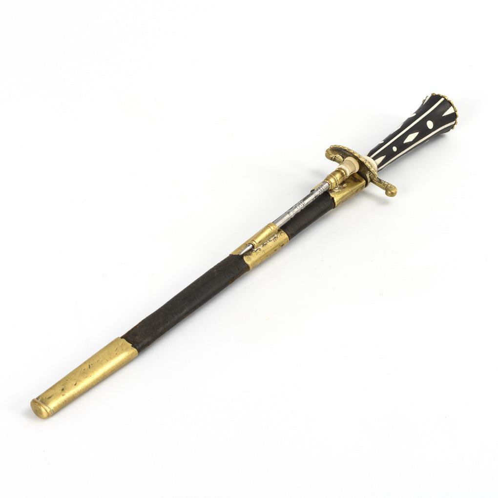 Straight, double-edged blade. Struck "...NIOLA..." in the hollow grind on both sides. Small brass quillons with shell-like thrusting blade. Conical grip made of black wood and bone inlays, brass rosette-shaped pommel. Leather scabbard with small awl. blade with corrosion scars.