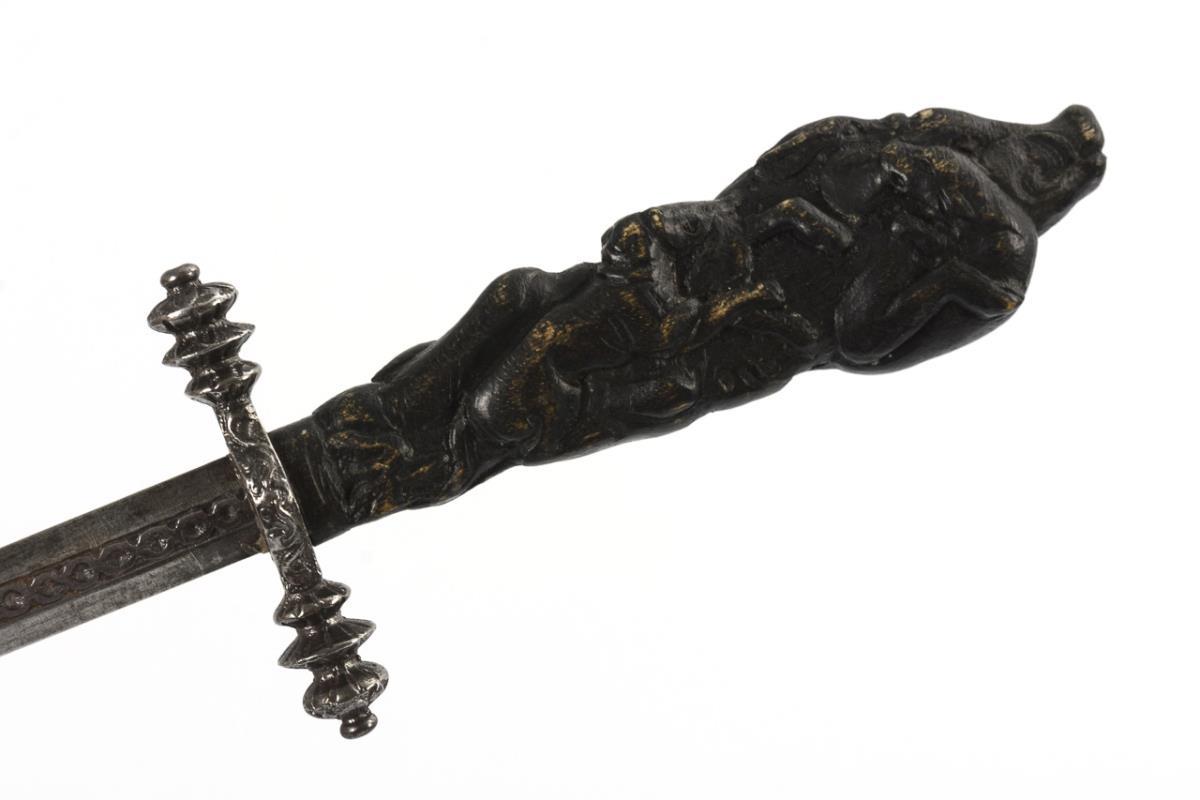 Double-edged, narrow blade with oval cross-section. In the midline, up to the half of the blade, continuous decoration. Parry bar made of decorated disc elements. Carved wooden handle with plastic hunting scene. Handle probably added in the style younger.