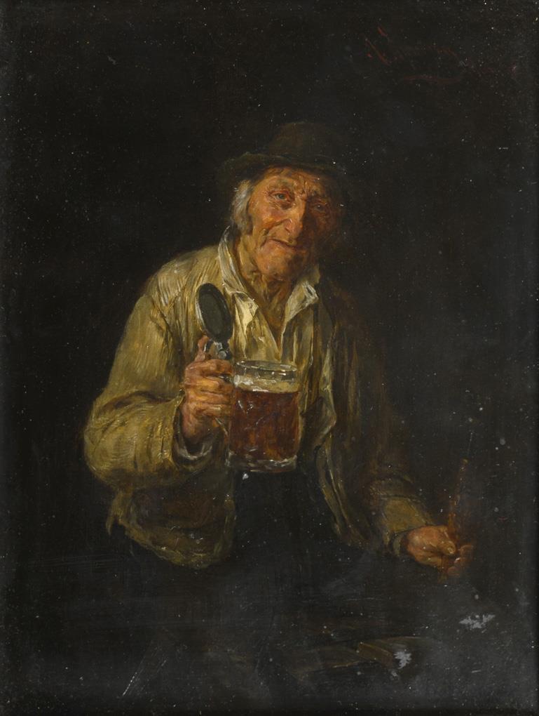 Bavarian peasant with beer mug and pipe executed in fine glazing painting.