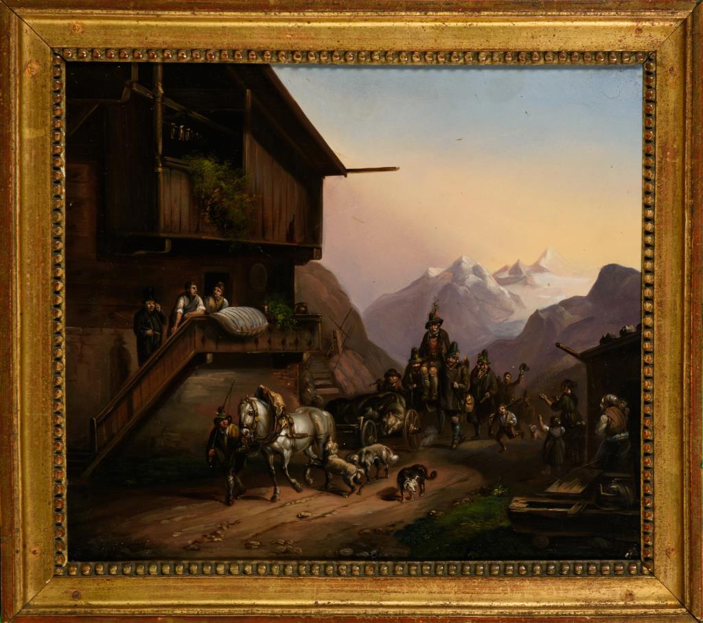 Männer tragen den gefeierten Schützen des erlegten Bären auf den Schultern, während sie unter dem Jubel der Bewohner in die Stadt einziehen. Ein kleines Loch.