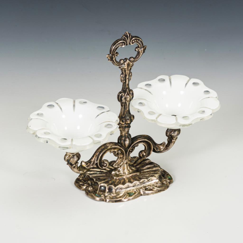 2 blütenförmige, weiße Schälchen mit Linsenschliff, auf Silbergestell mit Balusterschaft und 2 geschwungenen Armen. Altersspuren, Lötstellen, Glas mit Randchips.