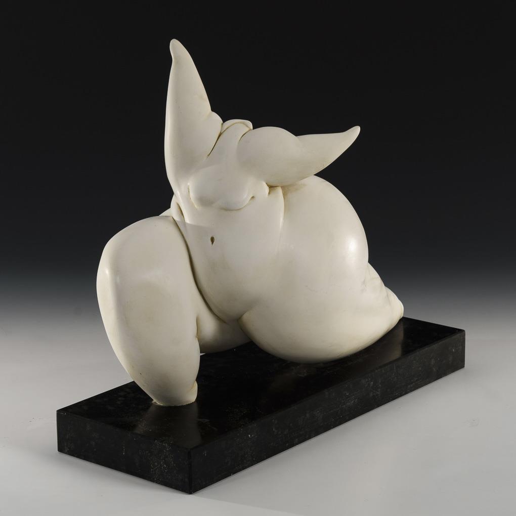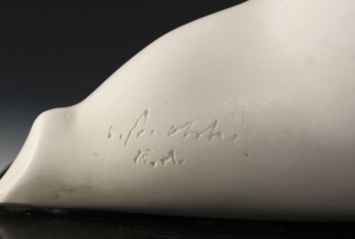 White cast stone, black diabase plinth. Inscribed with addition "E.A." H 35 cm, total 41 x 47 x 21 cm.