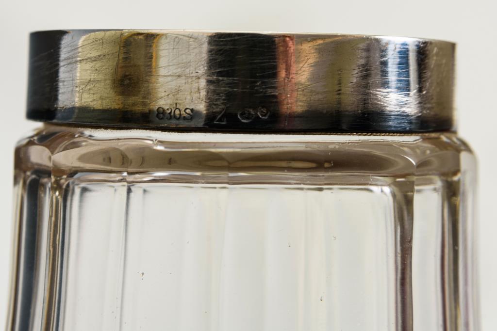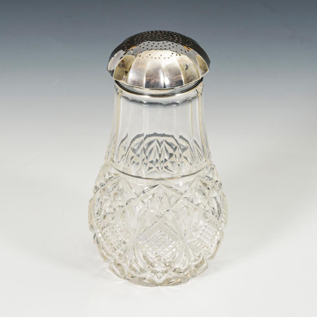 Leicht gebauchter Glaskorpus mit Waffelschliffdekor und gewölbtem Streudeckel. Glas mit winzigen Chips.