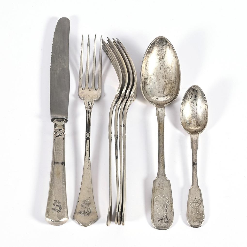 Simple form with monogram engraving: 5 forks and 1 knife with cross-band, 2 spoons in spade shape. Signs of age and use.