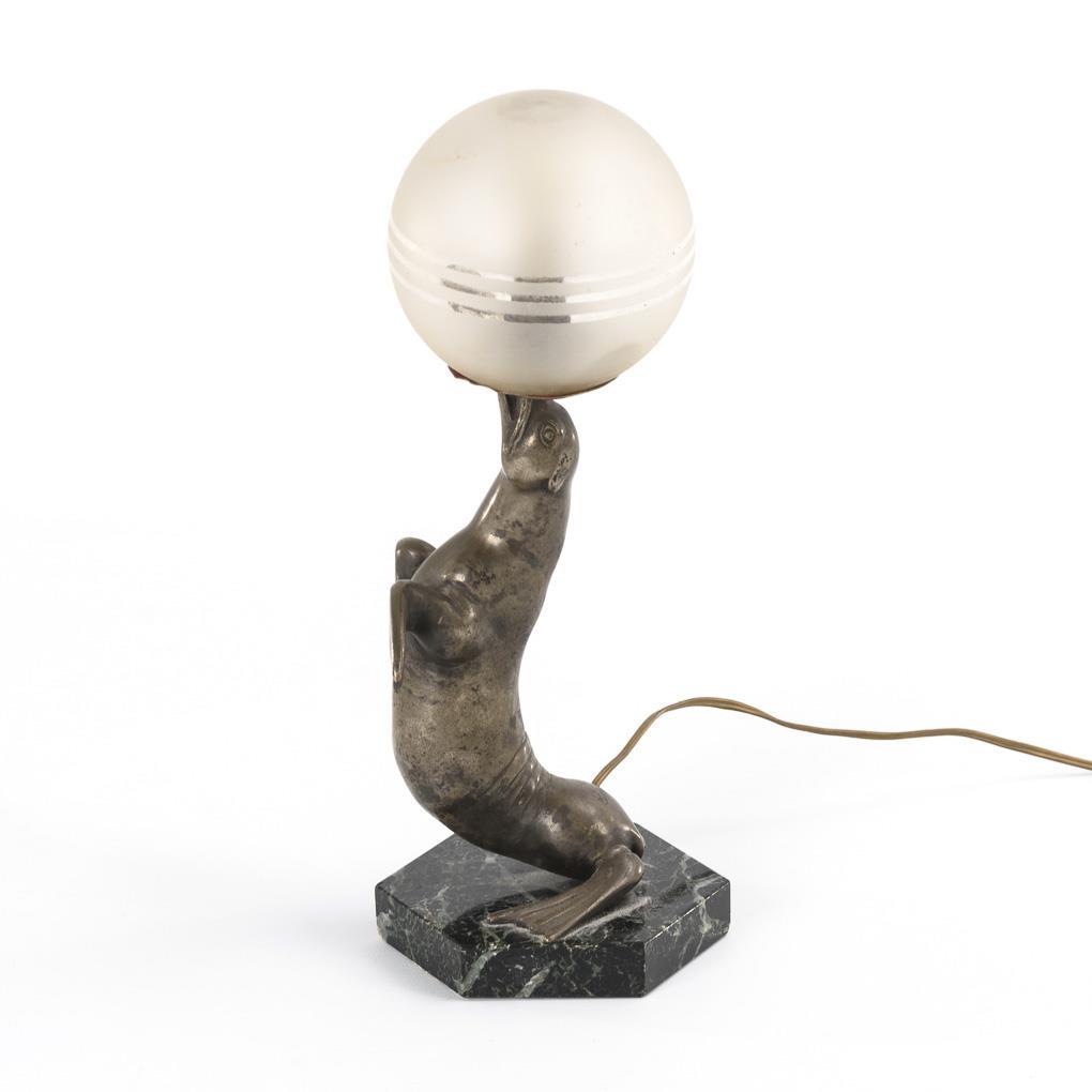 On hexagonal plinth fully plastic seal figure, balancing the spherical glass shade like a ball. Functioning. Patina heavily rubbed, minimal chips on the plinth.