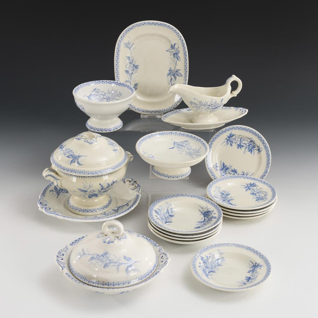 Tureen, lidded bowl, 5 dinner and 5 soup plates, sauce boat, 2 plates and 2 foot bowls.